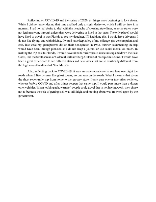 This story is about my family's experience of having to move during the COVID-19 pandemic from Georgia to Washington State and the road trip that took place. It was a stressful event because we did not know much about COVID-19 at the time and how it would affect us if we did contract the virus. We did not even have typical creature comforts to comfort us.
