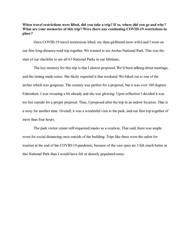 During the Covid-19 pandemic, I was mostly at home. I lived in, and currently reside in Miami FL. During the earlier stages of the pandemic, everything was closed, shops, national parks, malls and the like. The only things seemingly open were liquor stores, not sure why up to this day. My first moment outside of Miami, was after the restrictions were lifted and I took, a small staycation in Fort Lauderdale. Things were still pretty uneasy, and heavy mask mandates were still in place. I stayed at a smaller hotel in North Las Olas. And we spent the day in the beach, and went around to downtown Fort Lauderdale. The city seemed to be moving as normal, and the populace was very relaxed with social distancing, and mask mandates seemed to be abided only by a few. Nowadays any remnants of Covid restrictions are few if any. About 1 year after covid officially was put down to a low extent with the use of vaccines, I traveled to New Orleans, Louisiana and I noticed a very similar ambiance as to when I was in Florida almost right after the pandemic. All of the populace was very relaxed and laid back with masks and social distancing was at an absolute 0. My guess as to why these things occurred was with the mentality of certain demographics and political narratives. Southern states generally have a more laidback outlook on life and fear the overall reductions of personal liberty, such as travel, in regards to national emergencies. Where as states such as New York and California were some of the heaviest in Covid restrictions, some even present to this day. Travel was always a beautiful thing to do for me, and Covid-19 put a small halt on it, but not completely. These stories happened between August of 2020 and June of 2021.