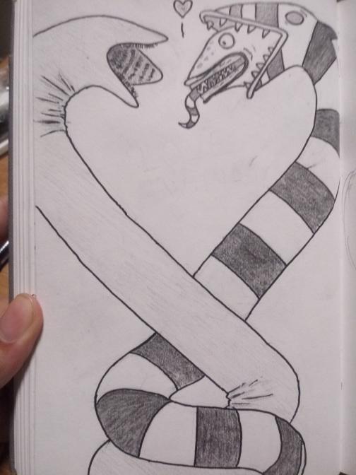 One day while I was talking about the atrocity that is the author of Ready Player One after watching Tremors, I mentioned how it'd be funny if the worm from Dune was gay and kissed the worm from Betelgeuse and the only way to do it would be in the sequel of Ready Player One, Ready Player Two. So my friend, naturally, had to draw gay worms.
