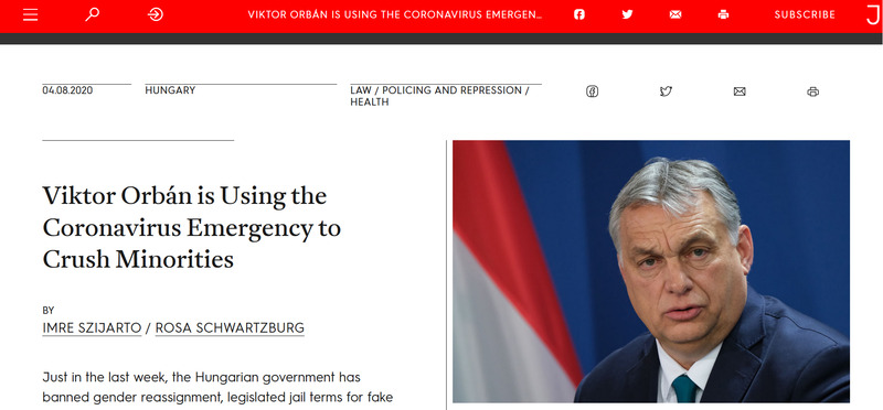 In an article for Jacobin Magazine, Imre Szijarto and Rosa Schwartzburg describe in length how the far-right government of Hungarian Prime Minister Viktor Orban has taken advantage of the COVID-19 pandemic to pass a law to give itself emergency powers over civil society and the other branches of government. These emergency powers, which include the ability to censor journalists, attacks on LGBTQ rights, the power to grant government contracts (to Orban's cronies), and the takeover of art institutions, represents a blatant power grab that is unprecedented in Europe since the 1930s. Indeed, Orban's emergency power decree has drawn comparisons to figures as varied as Adolf Hitler and Emperor Palpatine (in Hungarian language memes), and the European Union leadership has strongly condemned Orban's decree as akin the "Enabling Act," which was passed by the Nazis in 1933. Orban's autocratic power grab and the democratic backsliding experienced by Hungary were already underway before the pandemic, but COVID-19 has allowed Orban to use a "state of exception" to effectively suspend liberally democracy in Hungary for the foreseeable future.