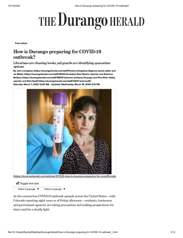 My husband, son and I moved (back) to Durango, Colorado from Monument at the end of February. We closed on our house, started back at school and reconnected with the friends we missed while we were away. Then the news stories started popping up here and there about a new and unidentified virus that is showing up in cities. "Good thing we live here!" I thought to myself. We live in the mountains, in a scattered neighborhood outside a small town in a sparsely-populated area of the country. We'll be fine.