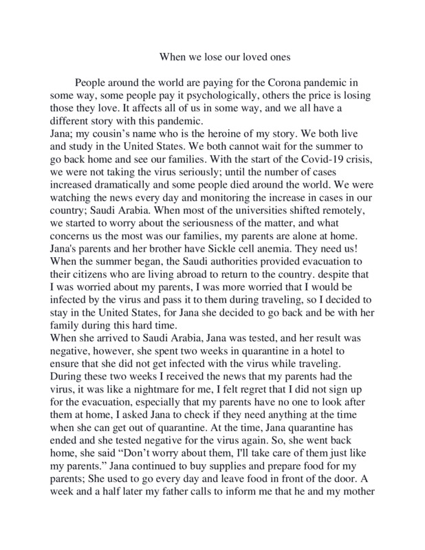People around the world are paying for the Corona pandemic in some way, some people pay it psychologically, others the price is losing those they love. It affects all of us in some way, and we all have a different story with this pandemic. This story brings what happened to me, one of my relatives, during the pandemic.