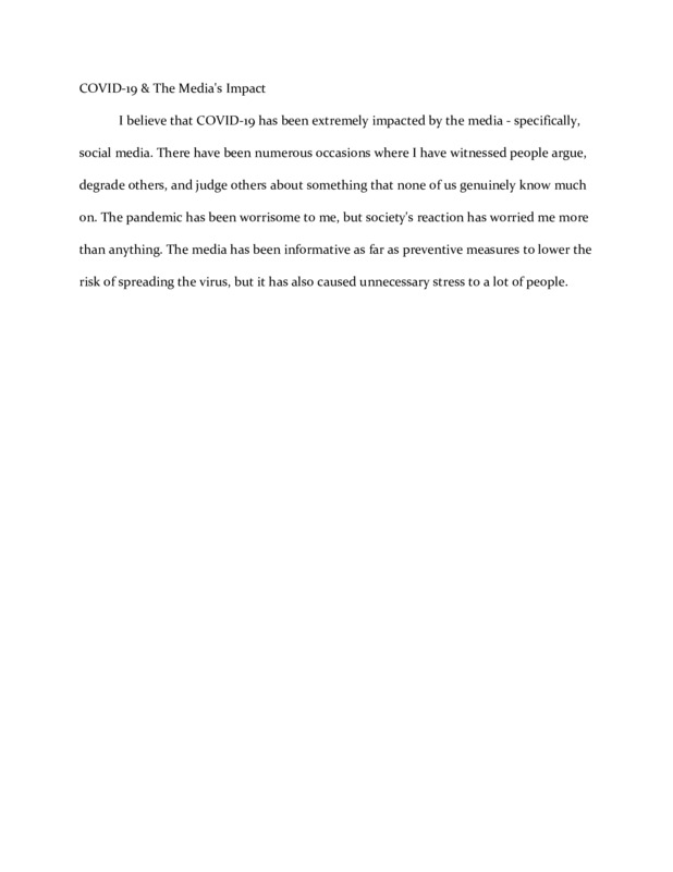 I believe that COVID-19 has been extremely impacted by the media - specifically, social media. There have been numerous occasions where I have witnessed people argue, degrade others, and judge others about something that none of us genuinely know much on. The pandemic has been worrisome to me, but society's reaction has worried me more than anything. The media has been informative as far as preventive measures to lower the risk of spreading the virus, but it has also caused unnecessary stress to a lot of people.