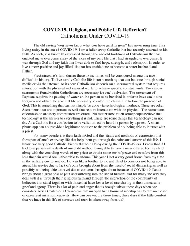 This year has been a difficult year for myself. I have had to endure many uncertainties in my personal life such as the loss of a very close friend due to suicide and the practice of my religion has been something that has helped me to cope with depression and despair but the practice of religion has been something difficult to do during this time that requires social distancing. I thought I could perhaps contribute my personal feelings and emotions as it relates to the practice of religion in the everyday world of a person during this moment in time.