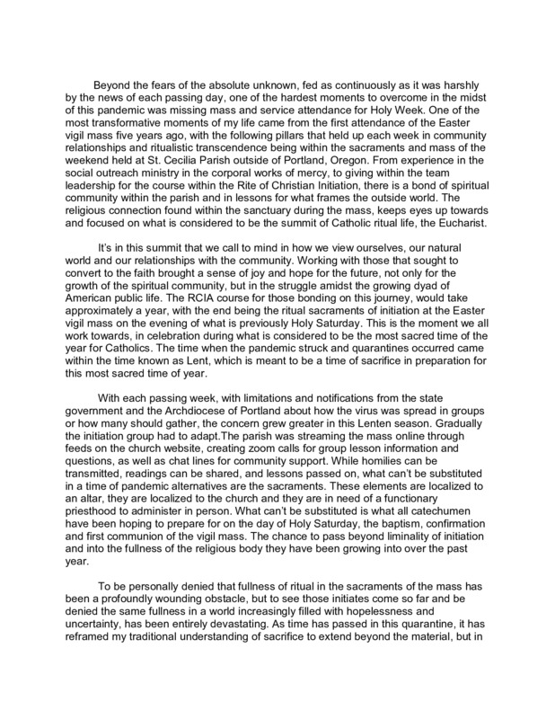 This is a story about the quarantine separating me, and most importantly others in my community, from participating not only in the sacrifice of the mass but also catechumens from receiving the sacraments of initiation during Holy Week. It's the most sacred time of the year for Catholics. It marks not only the anniversary of a deeply changing experience for me, but it's the time when I can see candidates enter the body of the church fully, and for that body to either be baptized or renew their baptismal vows.