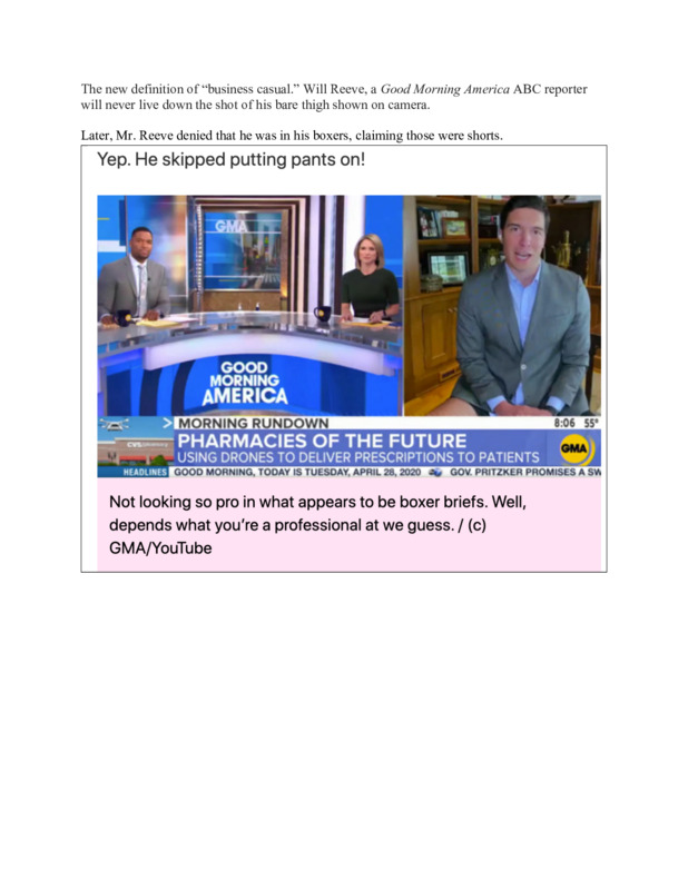 Will Reeves, a reporter for Good Morning America, a well-known morning TV show, was caught wearing no pants during his segment. This is how many people worked from home during the quarantine. Some were caught, but most of us weren't on national television.