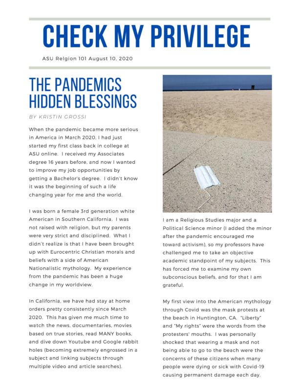 When the pandemic became more serious in America in March 2020, I had just started my first class back in college at ASU online. I received my Associates degree 16 years before, and now I wanted to improve my job opportunities by getting a Bachelor's degree. I didn’t know it was the beginning of such a life changing year for me and the world. (To read more, click on PDF)