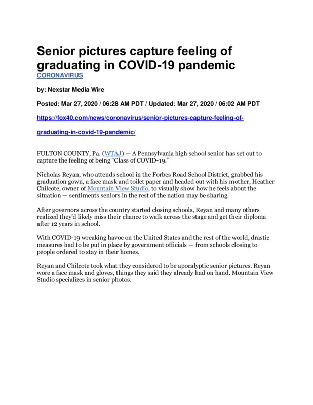 This is the story of a 2020 high school graduate, Nicholas Reyan, in Pennsylvania. His mother owns a photography studio--one that takes the senior pictures you see in yearbooks. This year there was no graduation, so they set out to create photographic representations of what graduating now is like. Enjoy!