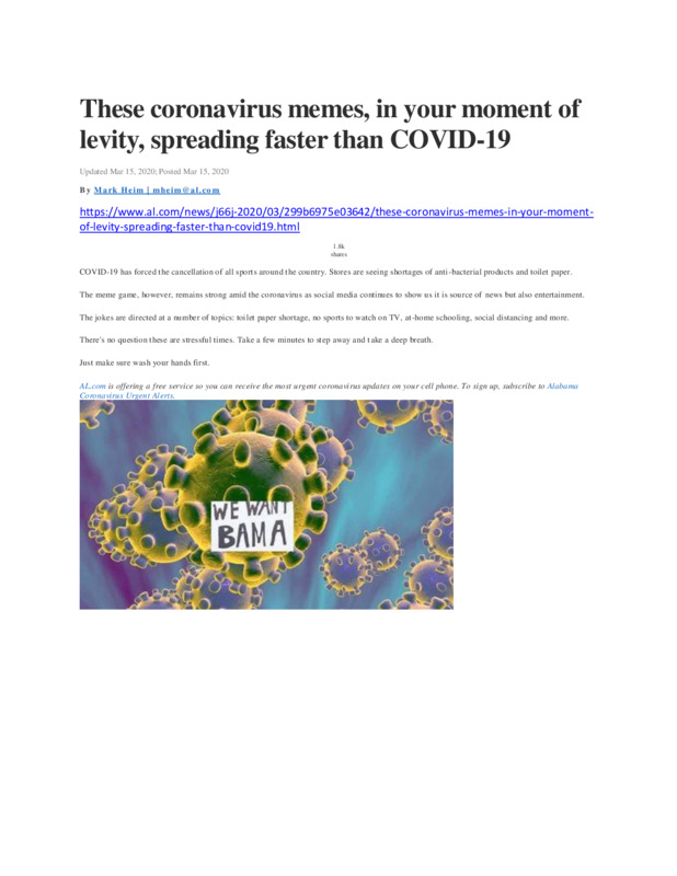 This is a collection of memes about the Coronavirus. Some good, some not so good, and some viral. Mostly good though. Humor is what helps us cope with stress and difficult times, so it is important.