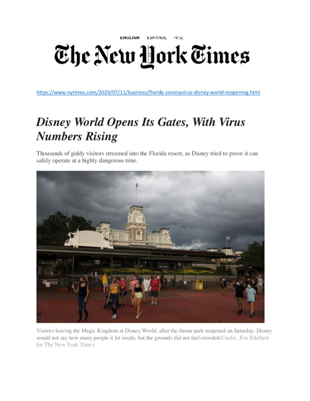 All Disney parks had to shut down in March of 2020 due to the Coronavirus. After 3 months, they decided to open. This was not without controversy, however, because at that point in time, Florida was leading the nation in the number of COVID cases. At this writing, they broke the record for the highest number of cases anywhere in the world for one day, and that was even before 9am.
