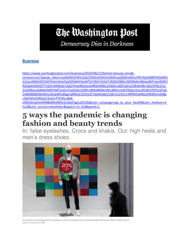 I have always been interested in fashion. This is an article about what people are wearing. Quarantine changed the need for business work clothes--except for the top half--the one that shows on the Zoom/video conferencing meetings and classes. This article lays out the comfortable clothes that people are wearing and buying. It discusses the financial squeeze people are finding themselves in.