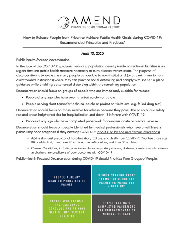 As covid-19 spreads throughout the population of the US several groups have seen it spread rapidly through their population. One such group are inmates at correctional facilities (jails, prison, detention centers). The disease spreads very quickly because social distancing is nearly impossible, facilities are overcrowded, and soap and cleaning supplies are in short supply. Advocates and families argue that it is imperative inmates that are not a threat to the public should be released early or allowed to continue serving their sentences under house arrest. This document was published by Amend. Amend is a University of California San Francisco program that “works to transform correctional culture inside prisons and jails and reduce the debilitating health effects of those environments.”