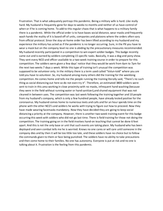 This is a story about my recent frustration with the the military's choices during this pandemic.It is important to tell the military side of the story because the official policies presented by the Department of Defense are not always adhered to at the installations and their story needs to be told.