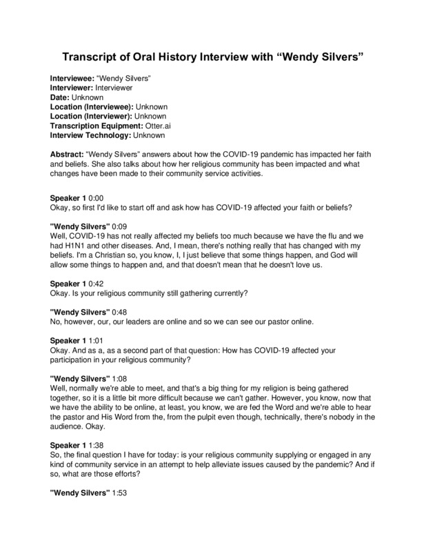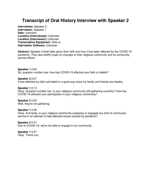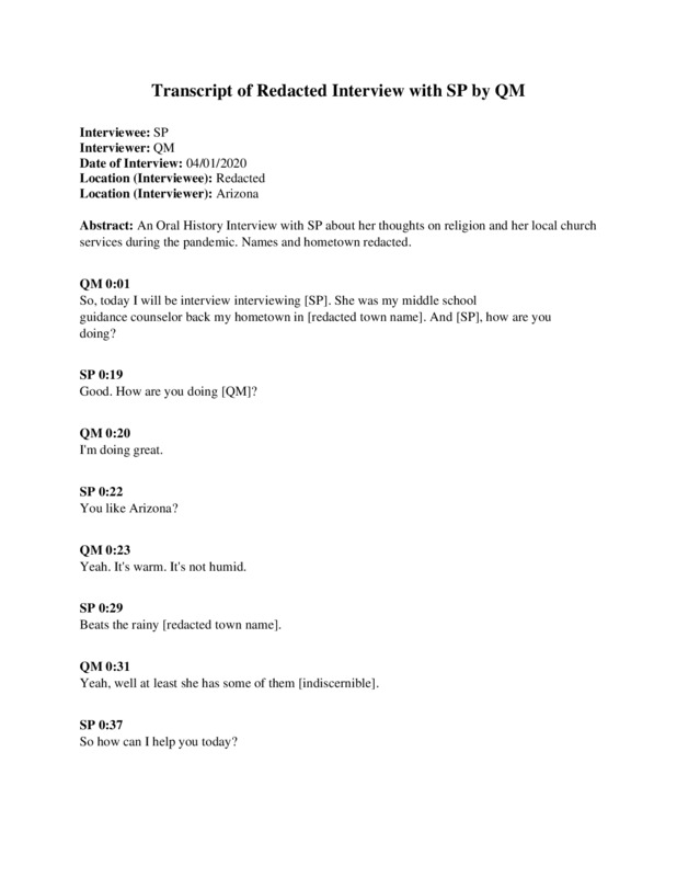 An anonymous Oral History Interview with SP about their thoughts on religion and local church services during the pandemic. Names and hometown redacted.