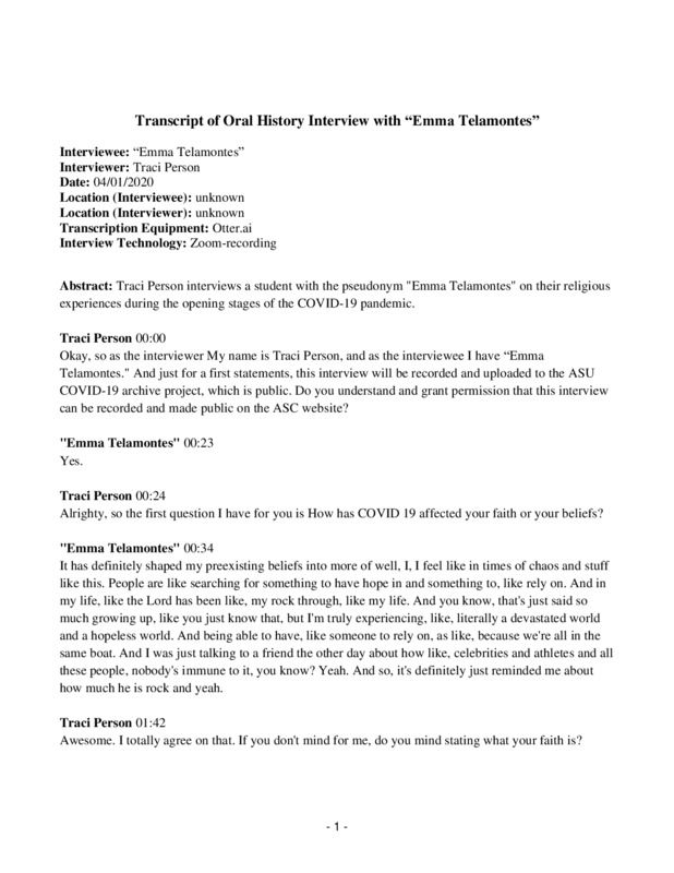 Traci Person interviews a student with the pseudonym "Emma Telamontes" on their religious experiences during the opening stages of the COVID-19 pandemic.