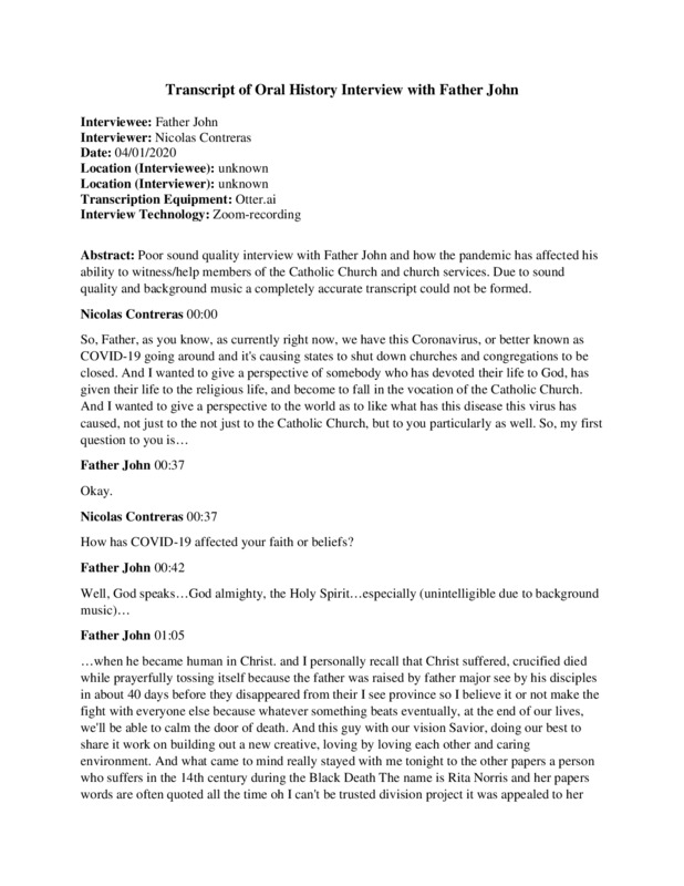 Nicolas Contreras interviews Father John about how the pandemic has affected the Catholic Church, it's local parishioners, community impact, and religious services. Poor audio and background noise.