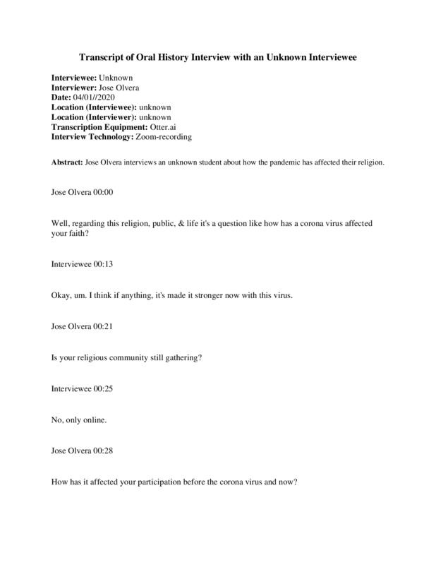 One student from REL101 interviews another about how the pandemic has affected their religion and their ability to attend services. Which creator is interviewer, or which is interviewee is unknown. However, both knew this would be a public interview.