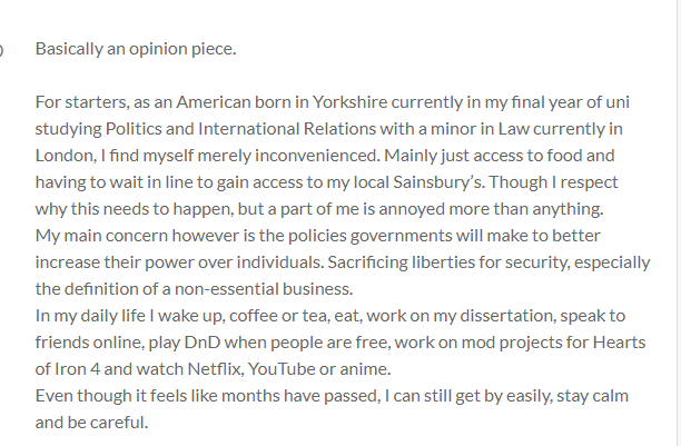 For starters, as an American born in Yorkshire currently in my final year of uni studying Politics and International Relations with a minor in Law currently in London, I find myself merely inconvenienced. Mainly just access to food and having to wait in line to gain access to my local Sainsbury’s. Though I respect why this needs to happen, but a part of me is annoyed more than anything.