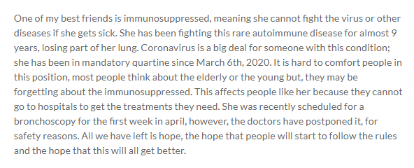 One of my best friends is immunosuppressed, meaning she cannot fight the virus or other diseases if she gets sick. She has been fighting this rare autoimmune disease for almost 9 years, losing part of her lung. Coronavirus is a big deal for someone with this condition; she has been in mandatory quartine since March 6th, 2020. It is hard to comfort people in this position, most people think about the elderly or the young but, they may be forgetting about the immunosuppressed. This affects people like her because they cannot go to hospitals to get the treatments they need. She was recently scheduled for a bronchoscopy for the first week in april, however, the doctors have postponed it, for safety reasons. All we have left is hope, the hope that people will start to follow the rules and the hope that this will all get better.