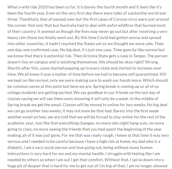 What a wild ride 2020 has been so far. It is barely the fourth month and it feels like it's been the fourth year. Even on the very first day there were talks of a potential world war three. Thankfully, that all passed over but the first cases of Corona-virus were just around the corner. Not only that but Australia had to deal with awful wildfires that burned most of their country. It seemed as though the fires may never go out but after receiving a very heavy rain those too finally went out. By this time Covid had gotten worse and spread into other countries. It hadn’t reached the States yet so we thought we were safe. Then one day, one confirmed case. No big deal, it's just one case. Time goes by like normal but we know that there is potential risk. Then Arizona State gets a case in Tempe. The person doesn’t live on campus and is isolating themselves. We should be okay right? Wrong. Shortly after this, cases started popping up in every state and started to increase over time. We all knew it was a matter of time before we had to become self quarantined. Still we kept on like normal, only we were making sure to wash our hands more. Which should be common sense at this point but here we are. Spring break is coming up so all of us college students are getting excited. We say goodbye to our friends on the last day of classes saying we will see them soon, knowing it will only be a week. In the middle of Spring break we get the email. Classes will be moved to online for two weeks. No big deal we can go another two weeks, it may not even be that bad. Barely into the first week another email arrives, we are told that we will be forced to stay online for the rest of the academic year. Just like that everything changes, no more late night hang outs, no more going to class, no more seeing the friends that you had spent the beginning of the year making, all of it was just gone. For me that was really rough. I knew at that time it was very serious and I needed to be careful because I have a high risk at home, my dad who is a diabetic. I am a very social person and love going out, being without many human interactions is very hard for me and my mental health. I struggle with feeling like I am needed by others so when I am out I get that comfort. Without that, I spiral down into a huge pit of despair that is hard for me to get out of. On top of that, I am no longer allowed to go out and see my boyfriend or my best friend. Without ever knowing that the last time I hung out with them was the last time I was able to see them for whoever knows how long. And I know you may be thinking, “oh that’s not that big of a deal, people are dying, people have lost their jobs and don’t know how to feed their families” you are totally right, my problems are not as significant as others around me, but that also doesn’t negate my feelings and experiences towards Covid-19. My prayers go out to all of the families that are experiencing loss, hunger, anxiety and uncertainty in this new phase of life that has been tossed to us. The only thing we can do as a population as a whole is help others in any way we can and stay home in order to flatten the curve. If we do our part then we can allow the doctors, nurses, pharmacists, and all the other health care workers help cure this virus and we can all return to normal before we know it.