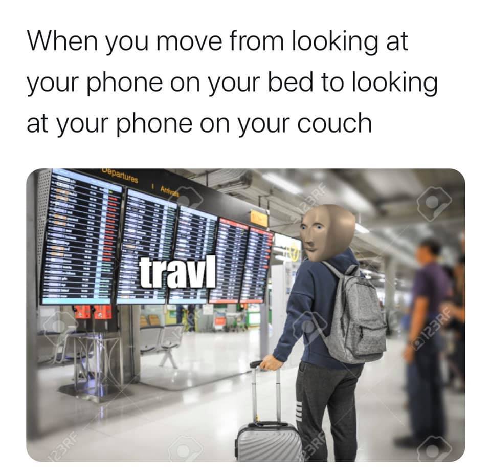 It is a meme about "traveling" from your bed to your couch to look at your phone in quarantine.