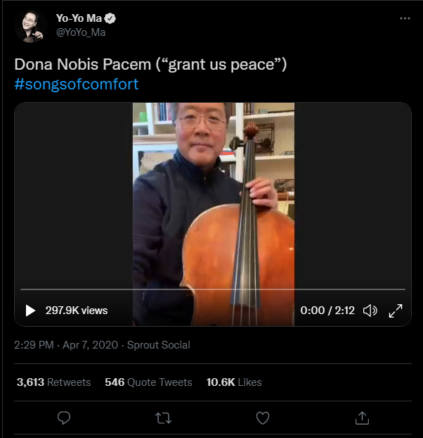 Tweet from Yo-Yo Ma with video of him playing Dona Nobis Pacem