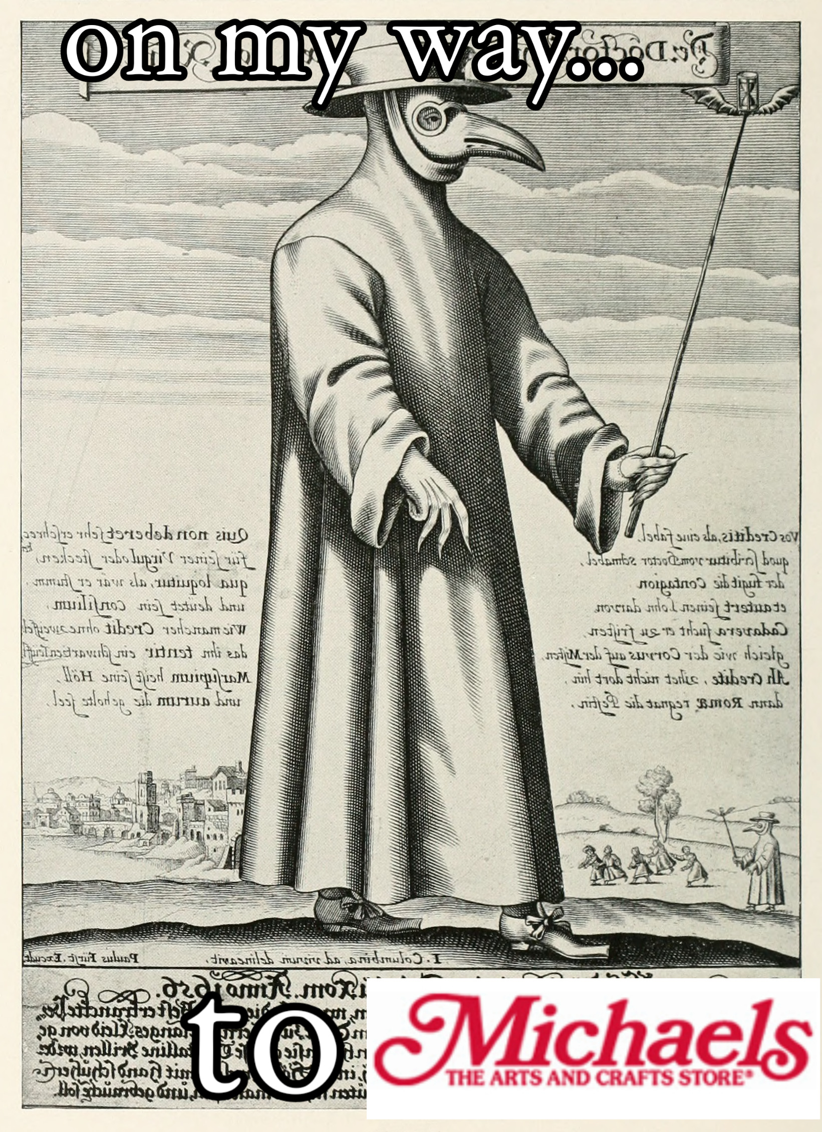 A meme comparing the coronavirus pandemic to the black death in the middle ages, showing a person wearing a plague doctors outfit to go to the store Michaels