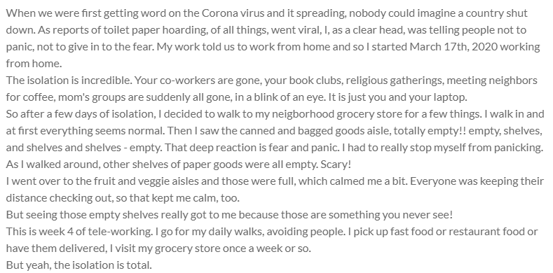 When we were first getting word on the Corona virus and it spreading, nobody could imagine a country shut down. As reports of toilet paper hoarding, of all things, went viral, I, as a clear head, was telling people not to panic, not to give in to the fear. My work told us to work from home and so I started March 17th, 2020 working from home.