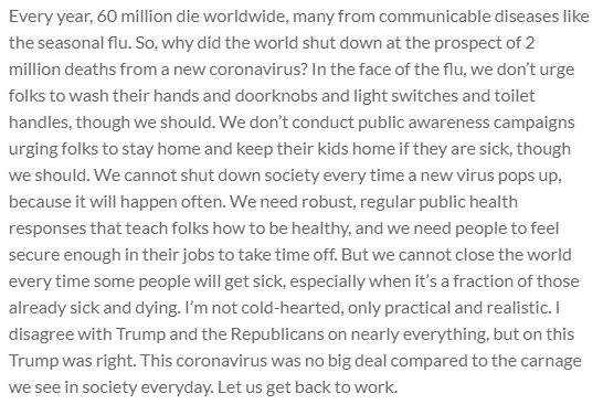 Every year, 60 million die worldwide, many from communicable diseases like the seasonal flu. So, why did the world shut down at the prospect of 2 million deaths from a new coronavirus? In the face of the flu, we don’t urge folks to wash their hands and doorknobs and light switches and toilet handles, though we should. We don’t conduct public awareness campaigns urging folks to stay home and keep their kids home if they are sick, though we should. We cannot shut down society every time a new virus pops up, because it will happen often. We need robust, regular public health responses that teach folks how to be healthy, and we need people to feel secure enough in their jobs to take time off. But we cannot close the world every time some people will get sick, especially when it’s a fraction of those already sick and dying. I’m not cold-hearted, only practical and realistic. I disagree with Trump and the Republicans on nearly everything, but on this Trump was right. This coronavirus was no big deal compared to the carnage we see in society everyday. Let us get back to work.