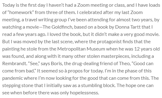 Today is the first day I haven’t had a Zoom meeting or class, and I have loads of “homework” from three of them. I celebrated after my last Zoom meeting, a travel writing group I’ve been attending for almost two years, by watching a movie—The Goldfinch, based on a book by Donna Tartt that I read a few years ago. I loved the book, but it didn’t make a very good movie. But I was moved by the last scene, where the protagonist finds that the painting he stole from the Metropolitan Museum when he was 12 years old was found, and along with it many other stolen masterpieces, including a Rembrandt. “See,” says Boris, the drug-dealing friend of Theo, “Good can come from bad.” It seemed so à propos for today. I’m in the phase of this pandemic where I’m now looking for the good that can come from this. The stepping stone that I initially saw as a stumbling block. The hope one can see when before there was only hopelessness.