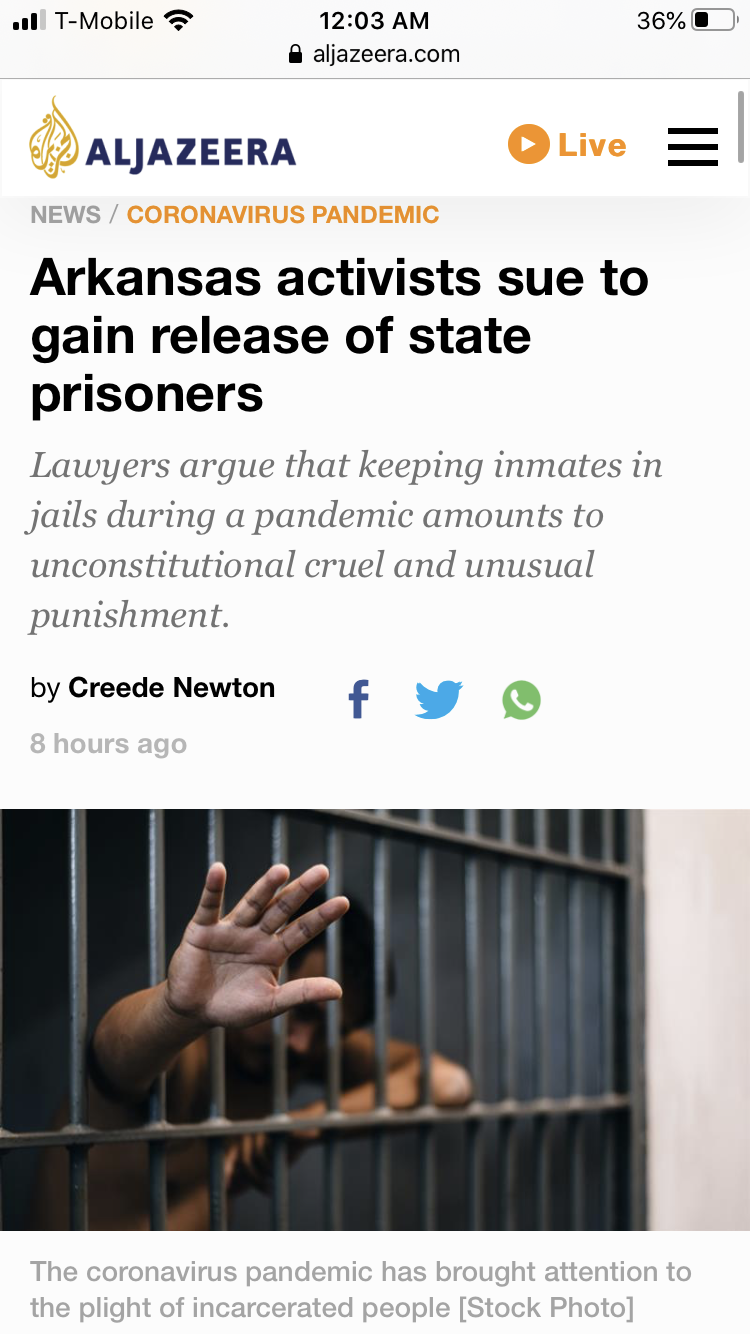 An article highlighting how 1/3 of Arkansas’ confirmed COVID-19 cases are incarcerated individuals. The ACLU, NAACP, and others are working together to get these at-risk individuals out of prison. Further, discusses racial disparities in Arkansas. Governor will review over 1000 prisoners’ records to determine if they can be released.