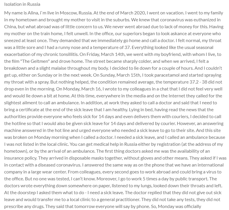My name is Alina, i`m live in Moscow, Russia. At the end of March 2020, I went on vacation. I went to my family in my hometown and brought my mother to visit in the suburbs. We knew that coronavirus was euthanized in China, but what abroad was of little concern to us. We never went abroad due to lack of money for this. Having my mother on the train home, I felt unwell. In the office, our superiors began to look askance at everyone who sneezed at least once. They demanded that we immediately go home and call a doctor. I felt normal, my throat was a little sore and I had a runny nose and a temperature of 37. Everything looked like the usual seasonal exacerbation of my chronic tonsillitis. On Friday, March 14th, we went with my boyfriend, with whom I live, to the film "The Geltmen" and drove home. The street became sharply colder, and when we arrived, I felt a breakdown and a slight malaise throughout my body. I decided to lie down for a couple of hours. And I couldn’t get up, either on Sunday or in the next week. On Sunday, March 15th, I took paracetamol and started spraying my throat with a spray. But nothing helped, the condition remained average, the temperature 37.2 - 38 did not drop even in the morning. On Monday, March 16, I wrote to my colleagues in a chat that I did not feel very well and would lie down a bit at home. At this time, everywhere in the media and on the Internet they called for the slightest ailment to call an ambulance. In addition, at work they asked to call a doctor and said that I need to bring a certificate at the end of the sick leave that I am healthy. Lying in bed, having read the news that the authorities provide everyone who feels sick for 14 days and even delivers them with couriers, I decided to call the hotline so that I would also be given sick leave for 14 days and delivered by courier. However, an answering machine answered in the hot line and urged everyone who needed a sick leave to go to their site. And this site was broken on Monday morning when I called a doctor. I needed a sick leave, and I called an ambulance because I was not listed in the local clinic. You can get medical help in Russia either by registration (at the address of my hometown), or by the arrival of an ambulance. The first thing doctors asked me was the availability of an insurance policy. They arrived in disposable masks together, without gloves and other means. They asked if I was in contact with a diseased coronavirus. I answered the same way as on the phone that we have an international company in a large wear center. From colleagues, every second goes to work abroad and could bring a virus to the office. But no one was tested, I can’t know. Moreover, I go to work 5 times a day by public transport. The doctors wrote everything down somewhere on paper, listened to my lungs, looked down their throats and left. At the doorstep I asked them what to do - I need a sick leave. The doctor replied that they did not give out sick leave and would transfer me to a local clinic to a general practitioner. They did not take any tests, they did not prescribe any drugs. They said that tomorrow everyone will say by phone. So, Monday was officially absenteeism. On Tuesday, March 17, they called me from my home number and asked if I called an ambulance yesterday. I said yes, I, my temperature has not been falling for 3 days now that I don’t know if I have a coronavirus or not and I need documents about the sick leave for work. It turned out to be a local clinic, which is standing in my courtyard of my rented apartment in the suburbs. They said that they transmitted information about me from the ambulance to further call the doctor to the house and draw up the sick-list. But they said right away that if I do not have a special policy in a plastic card in the Moscow region, they will not accept me and they will not send me a doctor, as they cannot register me at home. I told them that I have a policy of another city and I need help. To which they replied that the policy should not be changed for so long and that I should go and change. I replied that if I would infect 500 people on the way to their office in the subway and on the train, sitting in line for documents to replace the policy, then when they judge me, I’ll say that the local clinic didn’t accept me because of paperwork and therefore people got infected. They replied that I would get up anyway and go in for the design of the policy they needed. I felt bad, and, of course, I didn’t go anywhere, since I didn’t have a sick-list, and the design of the policy and further formalization of the hospital promised to be long and exhausting. I began to look for a paid clinic with a doctor’s visit to the house, as I still felt bad. But the clinics doubled the prices for leaving doctors and just 2 visits would cost me a fortune. Therefore, I signed up for the nearest clinic near the house and went there for an appointment. They met me, immediately measured the temperature, got sick leave, took a blood test and DNA analysis for various types of atypical SARS.