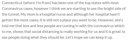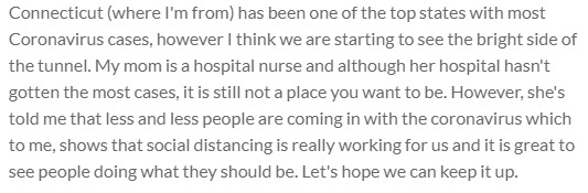 Connecticut (where I'm from) has been one of the top states with most Coronavirus cases, however I think we are starting to see the bright side of the tunnel. My mom is a hospital nurse and although her hospital hasn't gotten the most cases, it is still not a place you want to be. However, she's told me that less and less people are coming in with the coronavirus which to me, shows that social distancing is really working for us and it is great to see people doing what they should be. Let's hope we can keep it up.