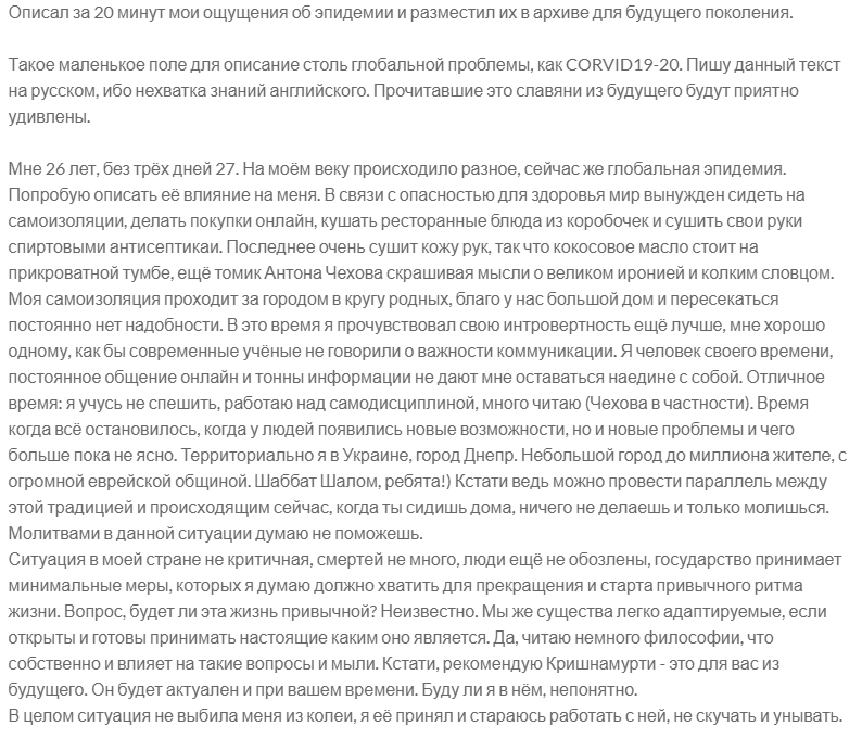 Описал за 20 минут мои ощущения об эпидемии и разместил их в архиве для будущего поколения.