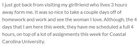 I just got back from visiting my girlfriend who lives 3 hours away form me. It was so nice to take a couple days off of homework and work and see the woman I love. Although, the 4 days that I am here this week, they have me scheduled a full 4 hours, on top of a lot of assignments this week for Coastal Carolina University.