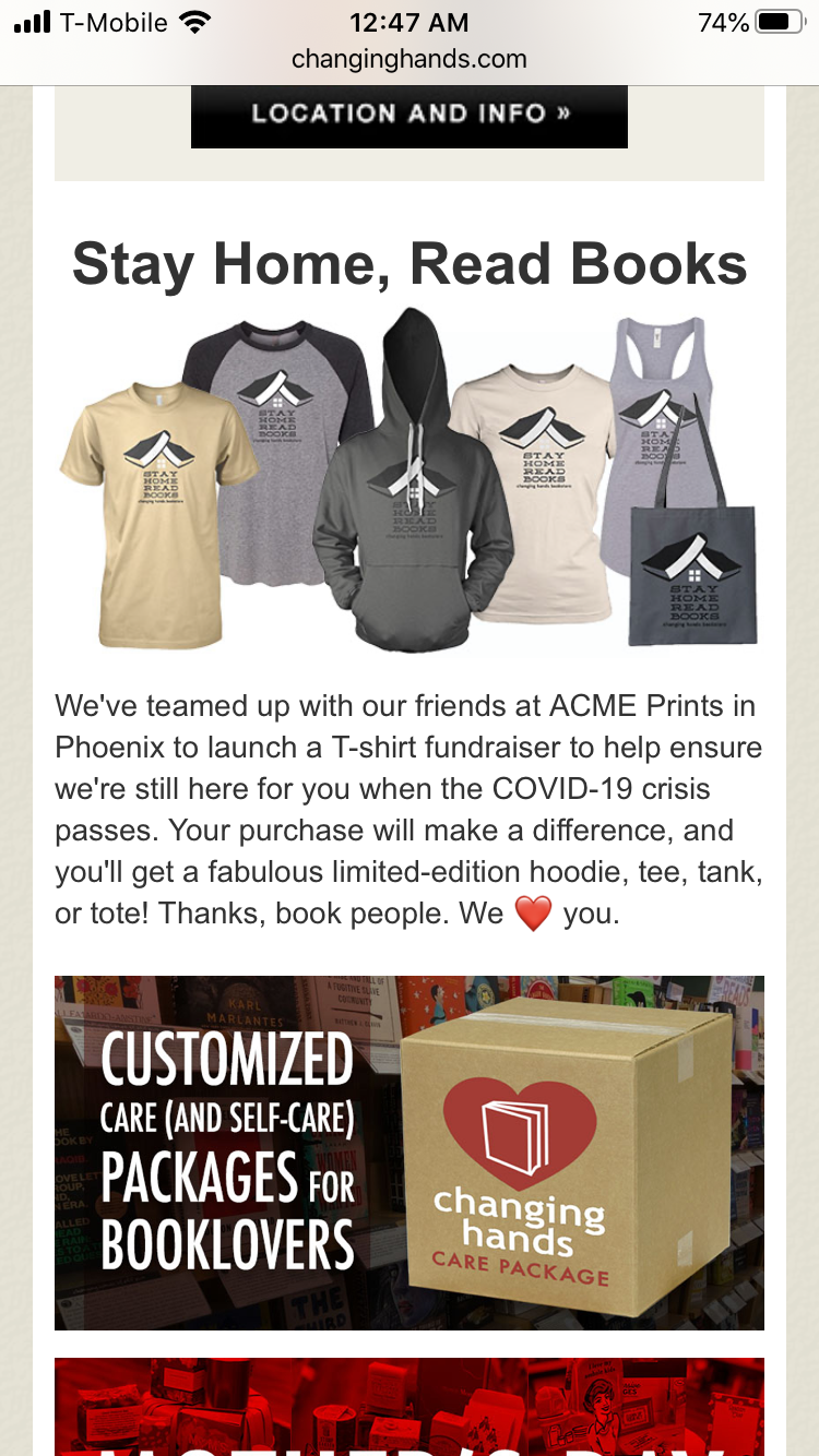 Changing Hands, a local bookstore with locations in Phoenix and Tempe, Arizona advertises merchandise reading “Stay home, save lives.” They’ve closed their bookstores to the public, but do online ordering that can be delivered to your house as well as curb side pick up at either of their two locations.