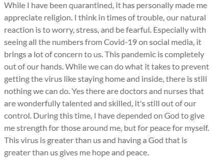 While I have been quarantined, it has personally made me appreciate religion. I think in times of trouble, our natural reaction is to worry, stress, and be fearful. Especially with seeing all the numbers from Covid-19 on social media, it brings a lot of concern to us. This pandemic is completely out of our hands. While we can do what it takes to prevent getting the virus like staying home and inside, there is still nothing we can do. Yes there are doctors and nurses that are wonderfully talented and skilled, it's still out of our control. During this time, I have depended on God to give me strength for those around me, but for peace for myself. This virus is greater than us and having a God that is greater than us gives me hope and peace.