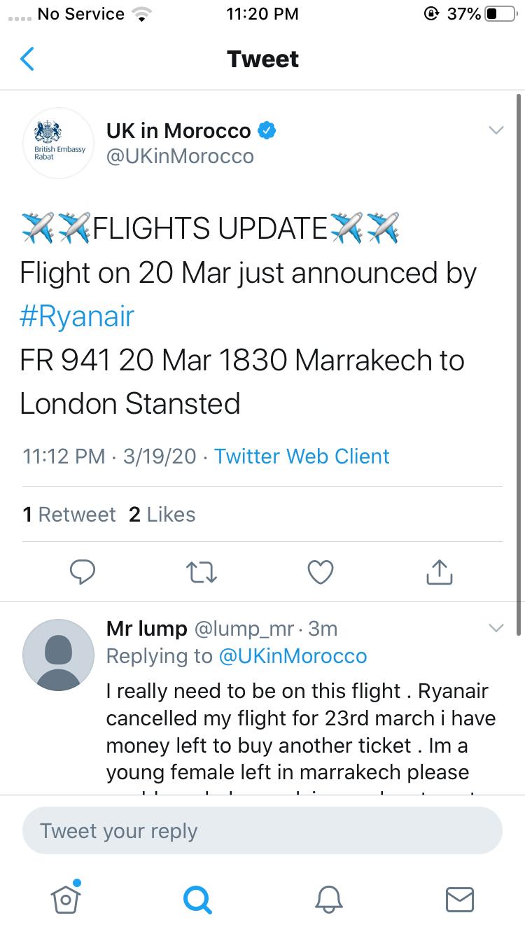 A screen shot of f this tweet to share with others in my What’s App group “Stranded in Morocco.” My wife and I were able to book this flight for a reasonable price. Might I note we were out in the Sahara Desert without service or news when the country shut down and after desperately trying to get help from our Embassy, with no success, we turned to the British Embassy for help and support. Original iPhone screenshot from Twitter. #HST643
