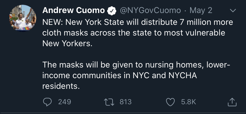 The new rule that Andrew Cuomo released makes everyone wear masks everywhere they go. He made this a rule so we can try to prevent the spread of Covid 19 even more. Although you need to wear masks not everyone has access to them because they are sold out at many places and some cant afford to buy them. Also many healthcare workers need them because they are running out and cant find them anywhere. SInce this is a big problem New York State gave 7 million more masks across New York.
