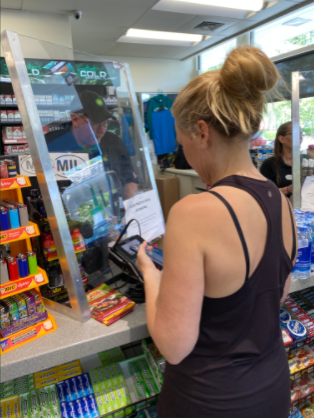 this image shows the impact of social distancing in stores and gas stations. employees place a shield in front of the cash registers to protect themselves.