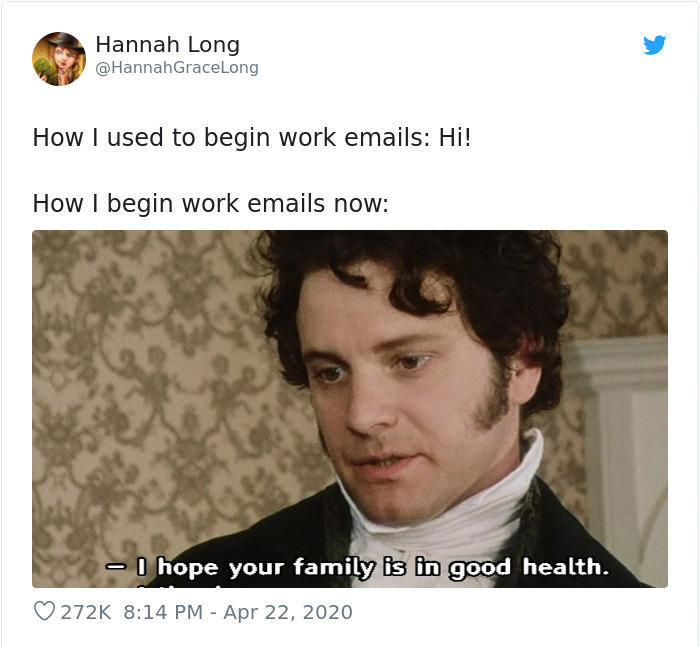This meme resonated with me because I'd noticed several other aspects of society that reverted to Austen-esque practices during COVID-19. Emails became more like letters; personal and sometimes lengthy. People really began to enjoy walks in pairs again. It forced us all to slow down and consider one another more.