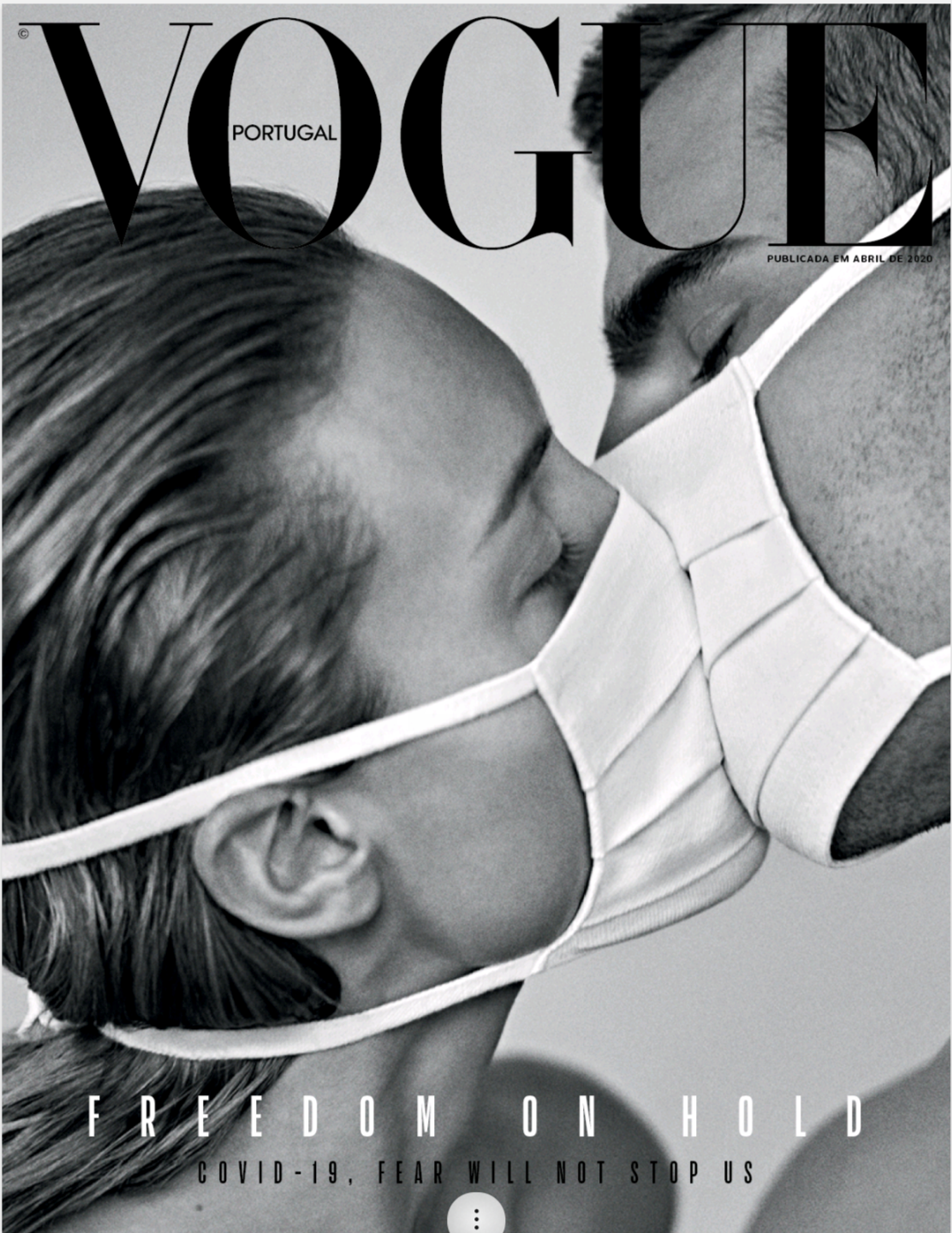 The cover for Vogue Portugal's April 2020 issue. Apparently, freedom is not on hold for Vogue magazine, as they are free enough to produce an entire issue and somehow shoot two people kissing through masks for their cover while trying to prevent a pandemic.
