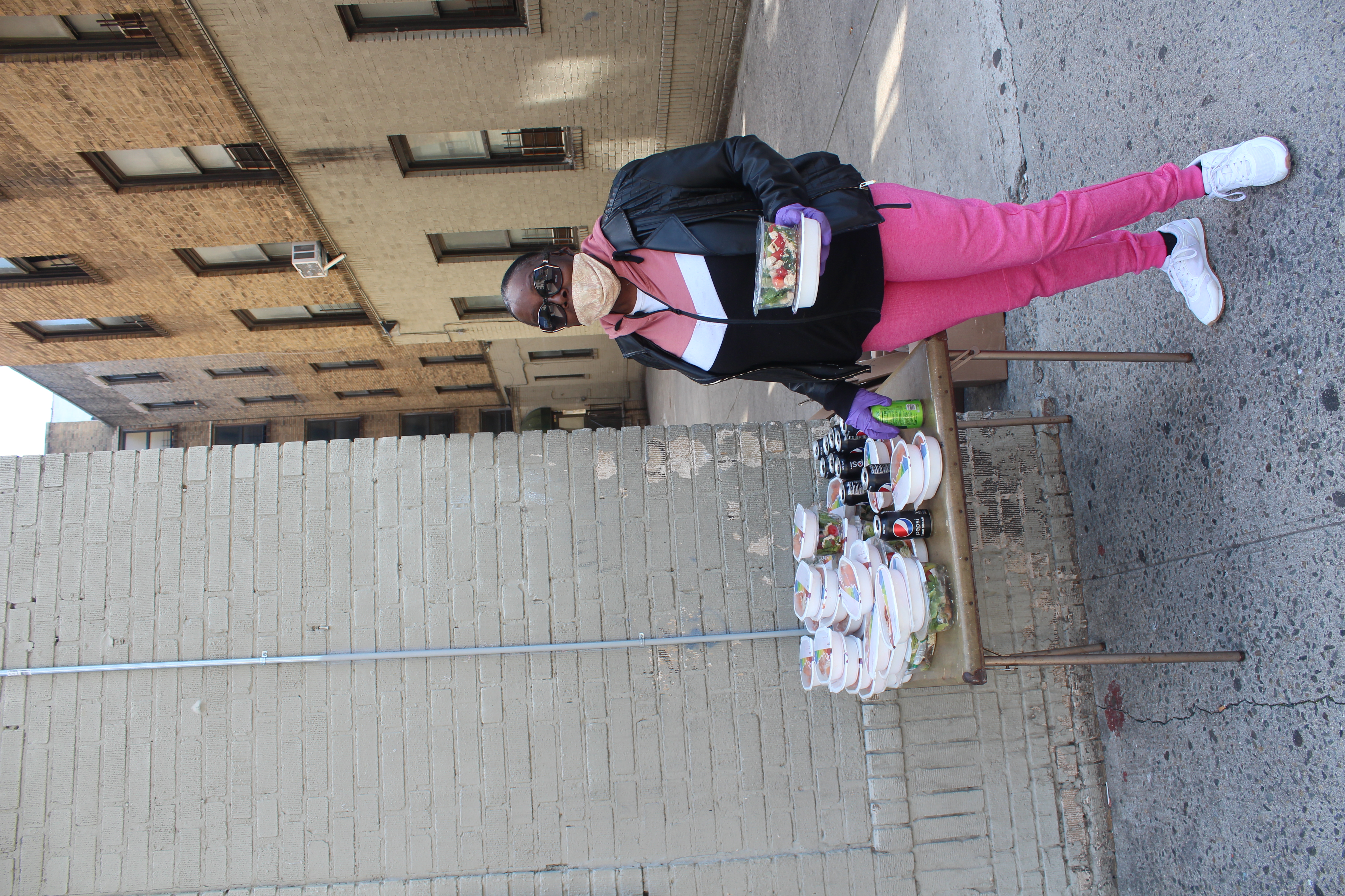 Ms. Mindy, a community organizer, hands out food she received from the Community board office, to the community.