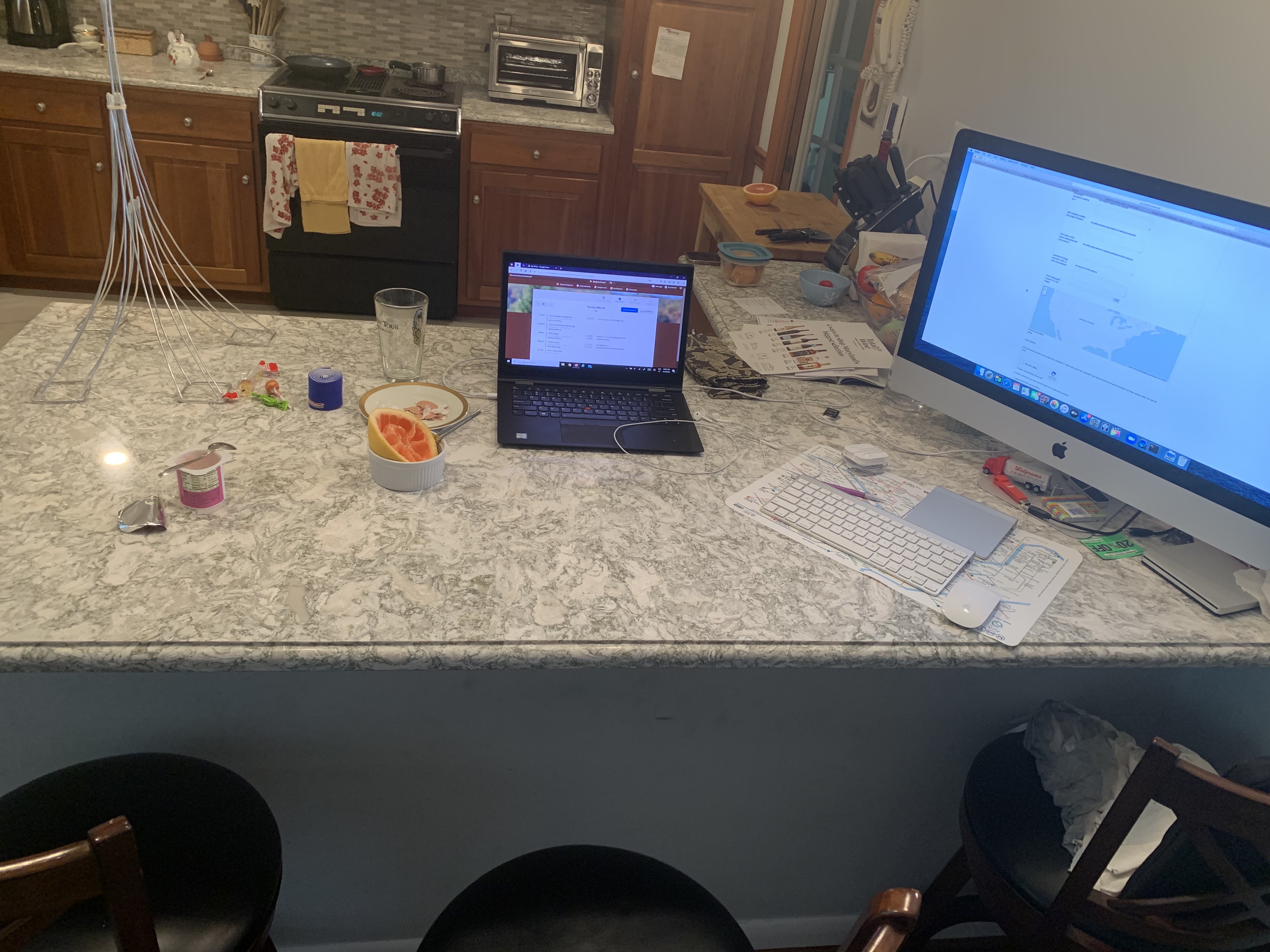 Since mid-March, my school has been doing online distance learning (ODL). And due to ODL, my kitchen counter has become my one-and-done workspace. It is my classroom, my art room, my breakroom, and, still, my kitchen counter. It has become a bit cluttered with my laptop; a desktop; a keyboard, mousepad, and cd drive; two sets of earbuds; my Eiffel Tower art project; a water glass; some random candy; a charging cable; an empty yogurt cup, a grapefruit half, and some eggshells from breakfast; a pencil; a USB drive; the list goes on. On the floor and table behind the frame are even more art supplies; a computer case that has been empty since March; my school books, binders, and notebooks; more pencils and pens; a graphing calculator. Almost everything I could possibly need during school – books, food, pencils, etc. – can now be found within a five-foot radius of where I sit; in effect, further limiting the already negligible distance I travel every day. 10:00 am.