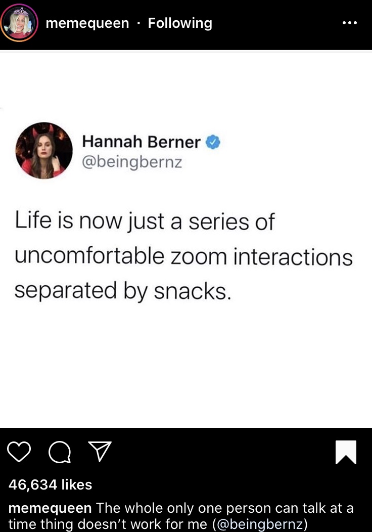 A meme found on Instagram describing how the transition to having everything online makes us feel