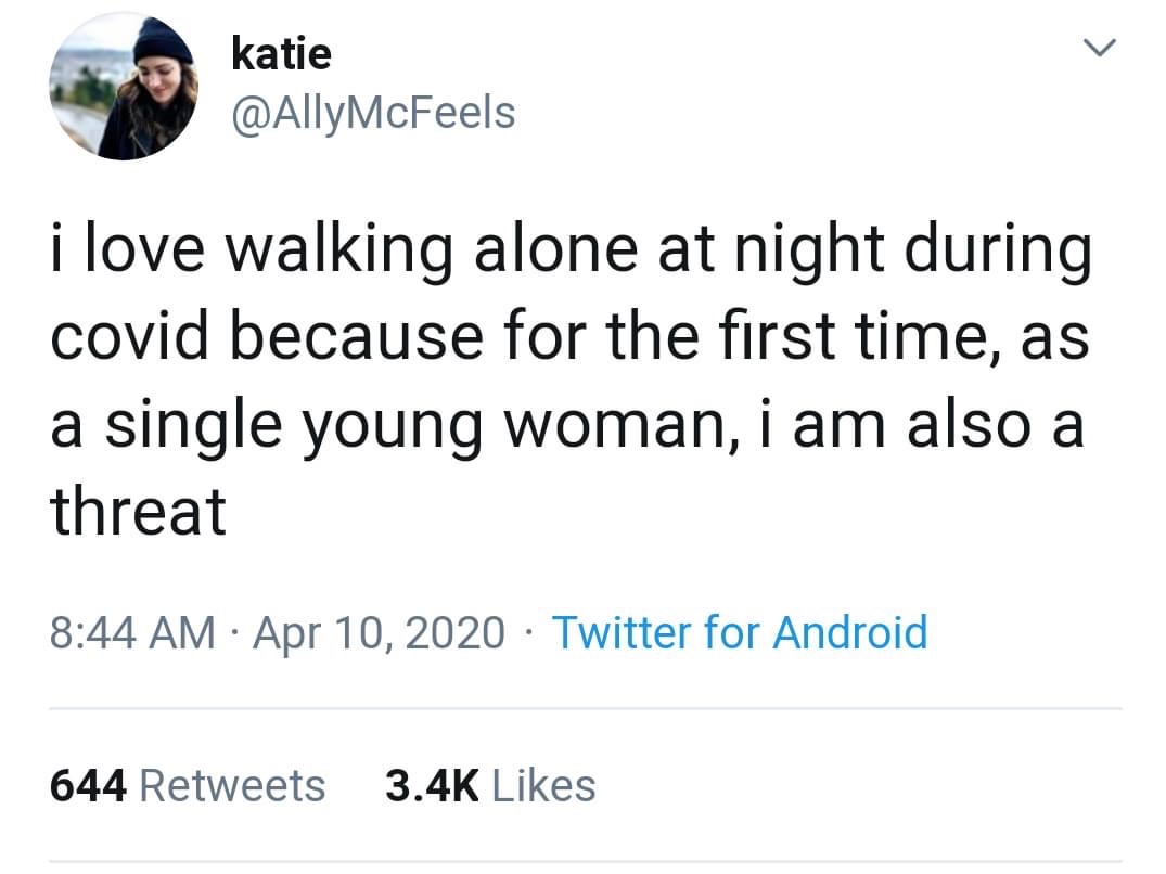 I thought this tweet was pretty humorous, but also had a harsh reality. During COVID-19, no strangers want to interact with each other because everyone is afraid of each other. Also, most of the time is spent inside so you don't have to worry about the threat of strange men. It is kind of sad to think about the fact that in society, this is the extreme it has to get to in order to feel safe from men. Even though, people leaving the house right now still feel far from safe with the threat of COVID.