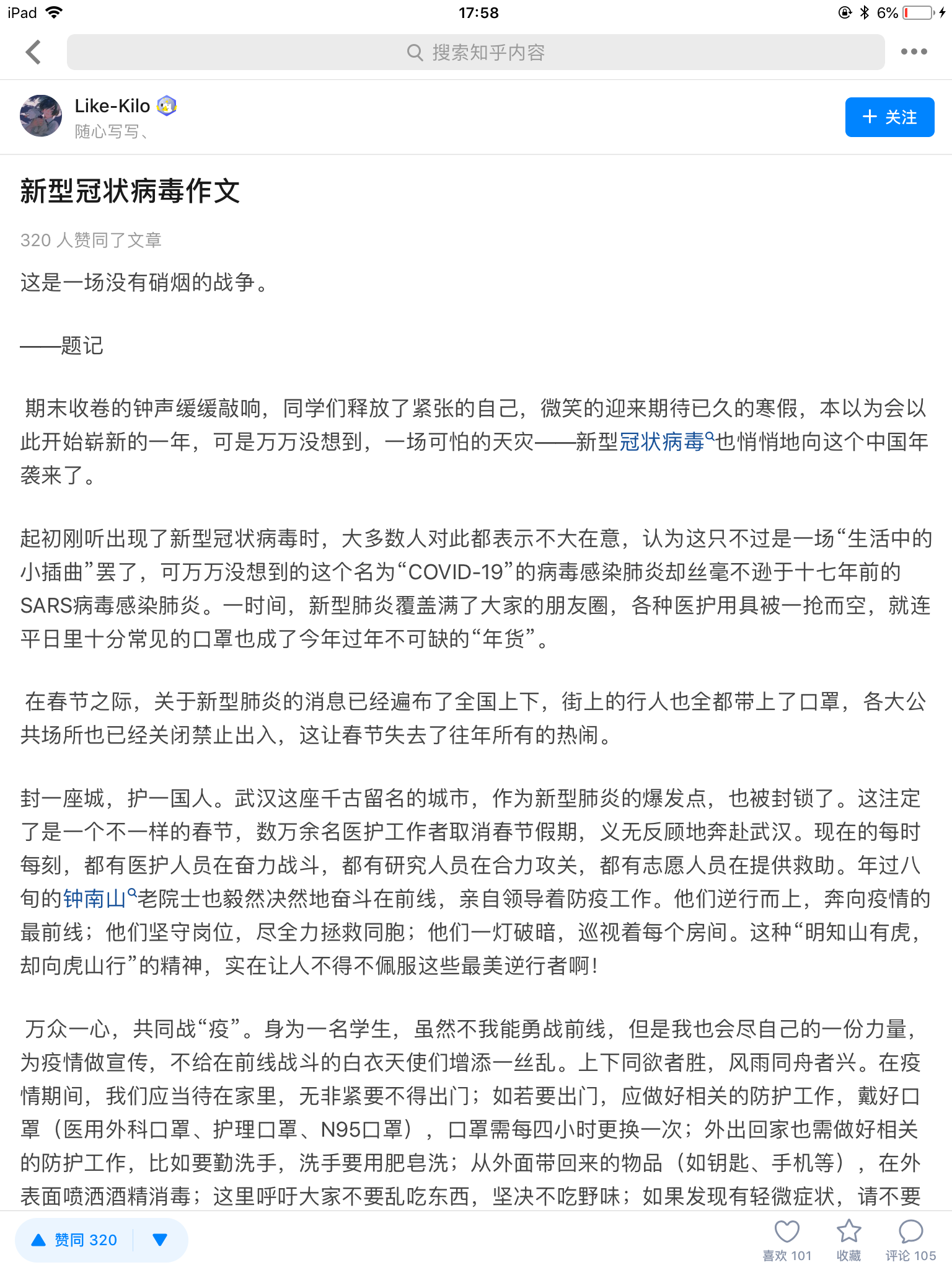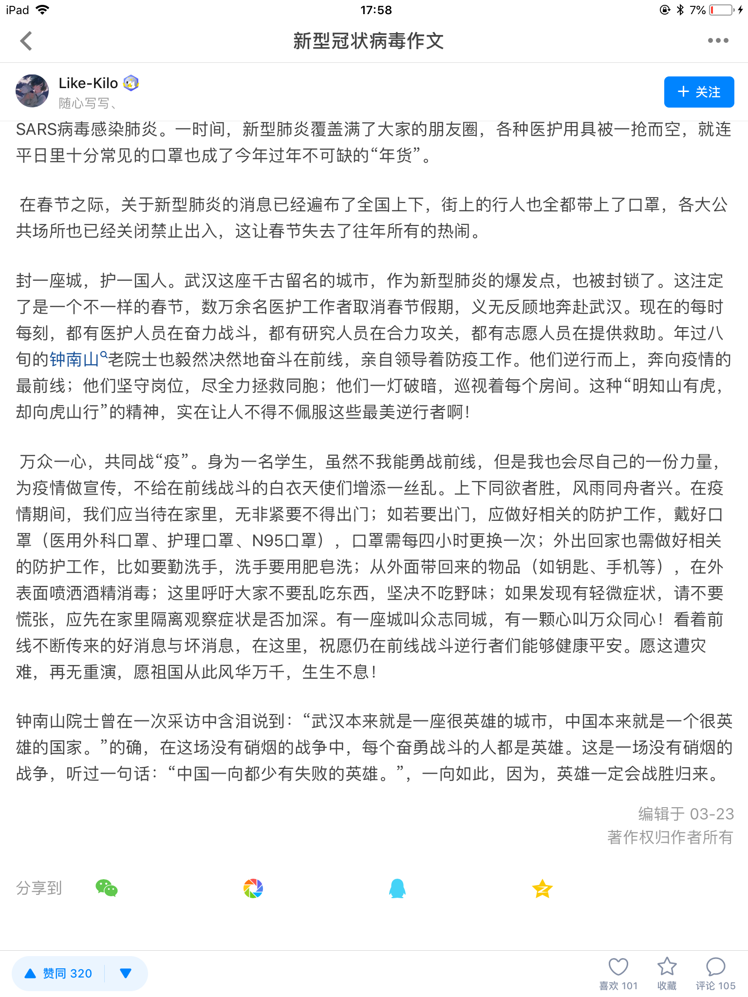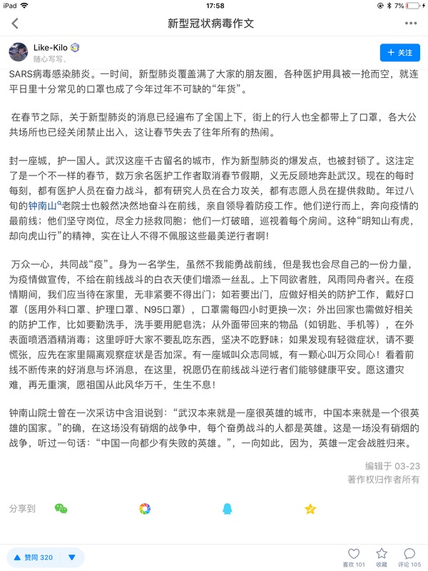The screenshot is a writing assignment submitted by student during the plague in China, it indicates the shift of social attention to the virus and also the effort people have put into resolving this issue.