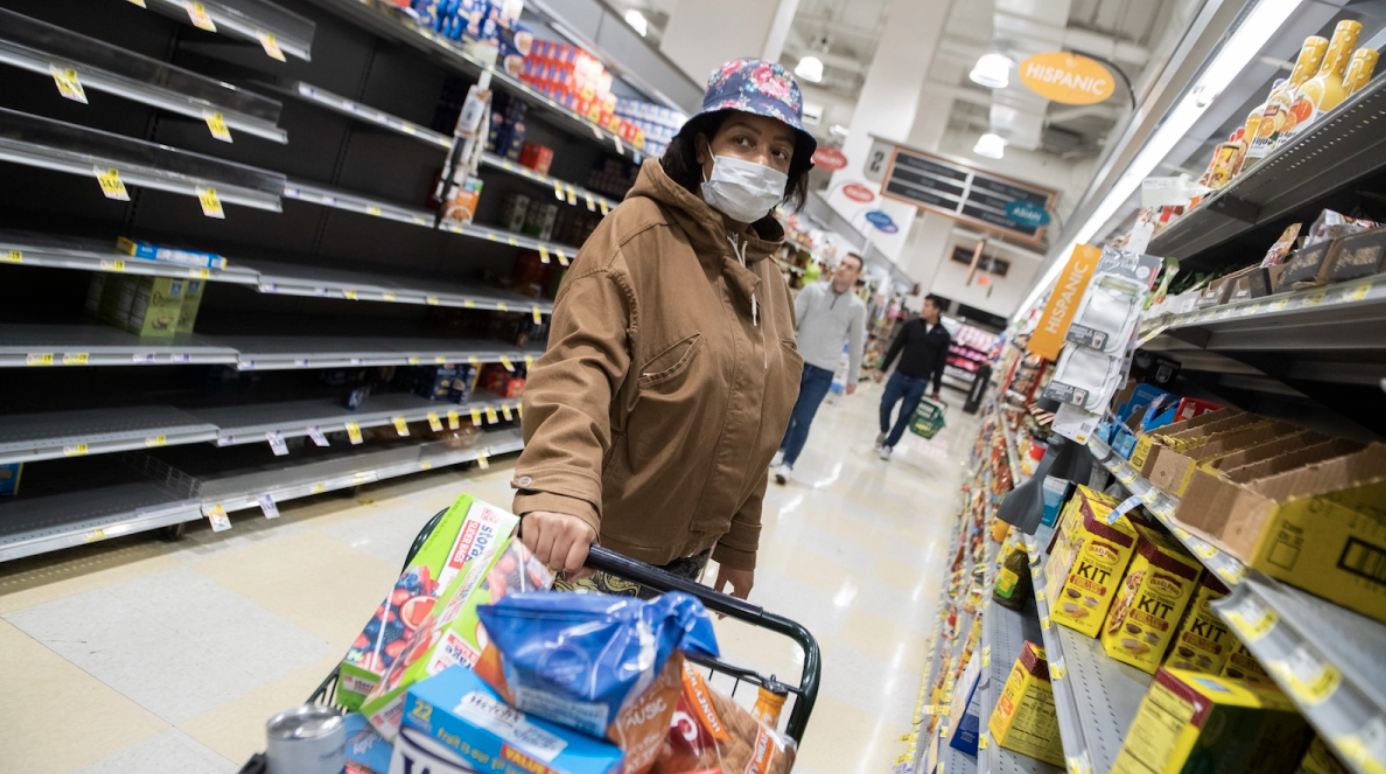The photograph shows a woman standing next to empty shelves at a Walmart. This is very true for the COVID-19 pandemic as nearly all of the stores went out of stock for certain things, especially toilet paper. In fact in my personal experience, there was no food available at the Walmart next door.