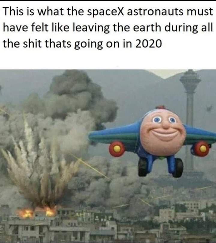 This meme is important because it makes fun of the current events happening in 2020. It tries to make the situation a little lighter by stating how the Nasa and SpaceX juncture sent astronauts to the International Space Station and how they should be happy of avoiding all the current problems in our planet.