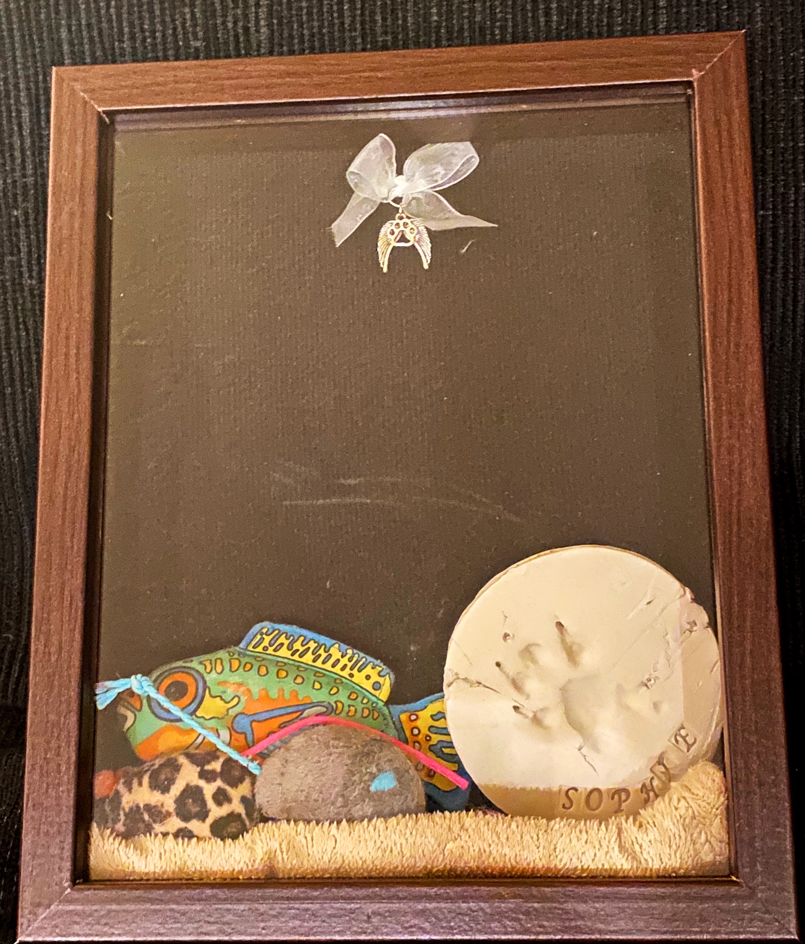 This image is of a shadow box in memoriam to my cat Sophie. Her health started declining in the beginning of the pandemic. My family had to call multiple vets just to get an appointment due to short staffing and were not allowed in the room with her in order to tell the vet things. When she had to be put down the news was told to us over the phone and we had to say our final goodbyes on a porch in front of other people. To me, this image represents my loss in the time of coronavirus.